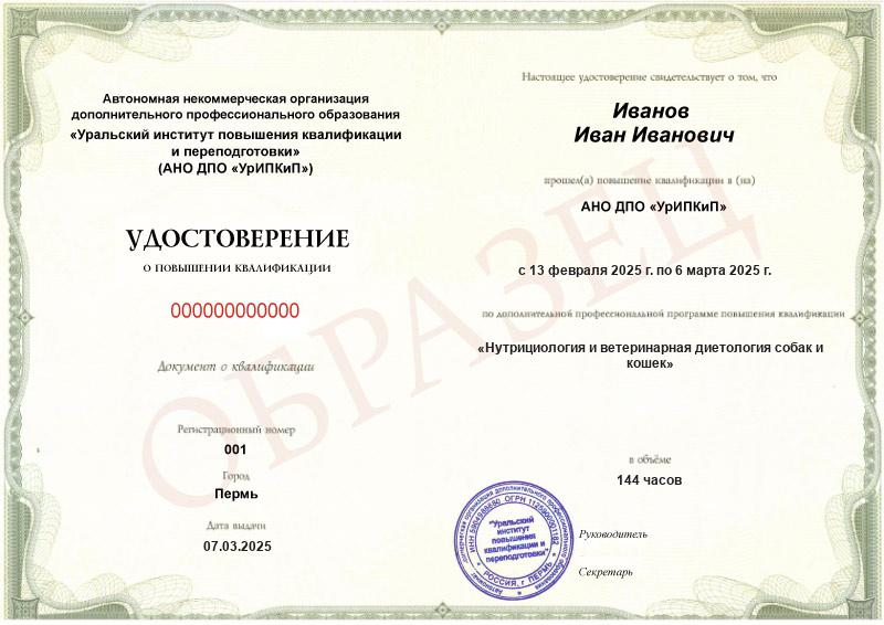 Курс обучения Нутрициология и ветеринарная диетология собак и кошек (144ч)