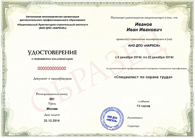 - Образец удостоверения о повышении квалификации.