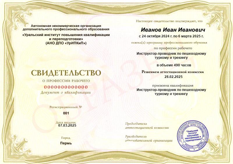 - Квалификация: Инструктор-проводник по пешеходному туризму и трекингу
