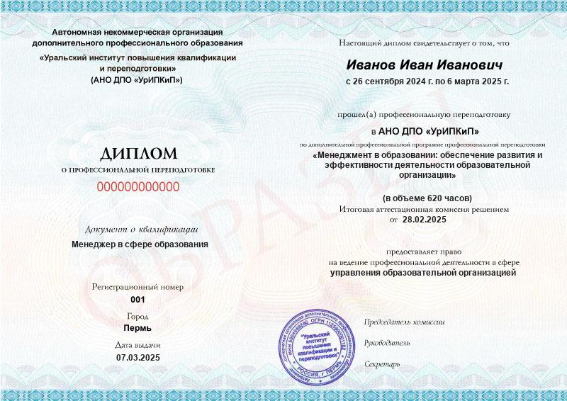 - Образец диплома о профессиональной переподготовке.