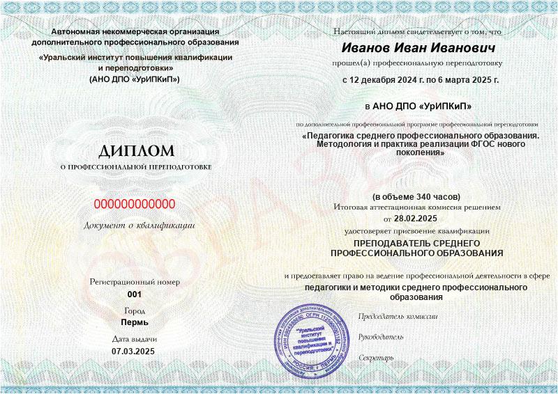 - Образец диплома о профессиональной переподготовке.