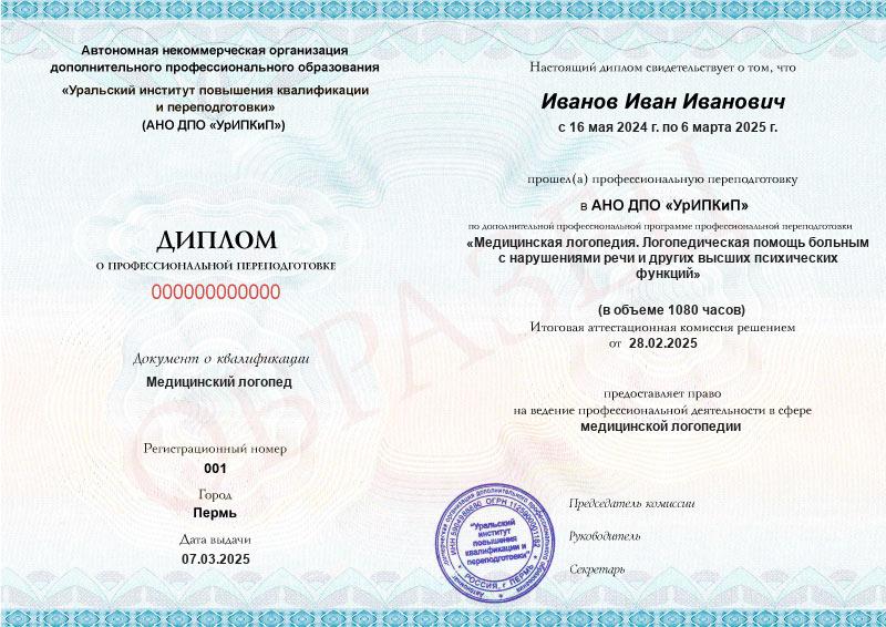 Курс обучения Медицинская логопедия. Логопедическая помощь больным с нарушениями речи и других высших психических функций (1080ч)