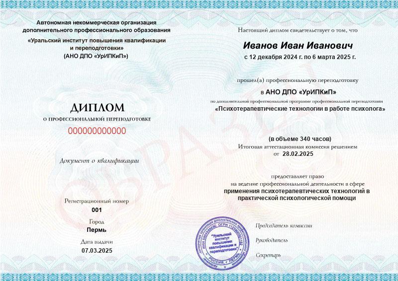 - Образец диплома о профессиональной переподготовке.