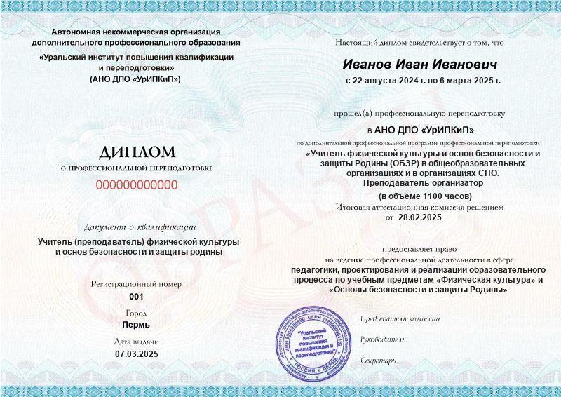 Учитель физической культуры и основ безопасности и защиты Родины (ОБЗР) в общеобразовательных организациях и в организациях СПО. Преподаватель-организатор ОБЗР (1100ч)