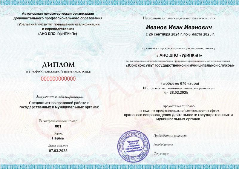 Да, дипломы и удостоверения оформляются в соответствии с действующим законодательством РФ. Документы печатаются на специальных бланках, заверяются печатью АНО ДПО «УрИПКиП».
